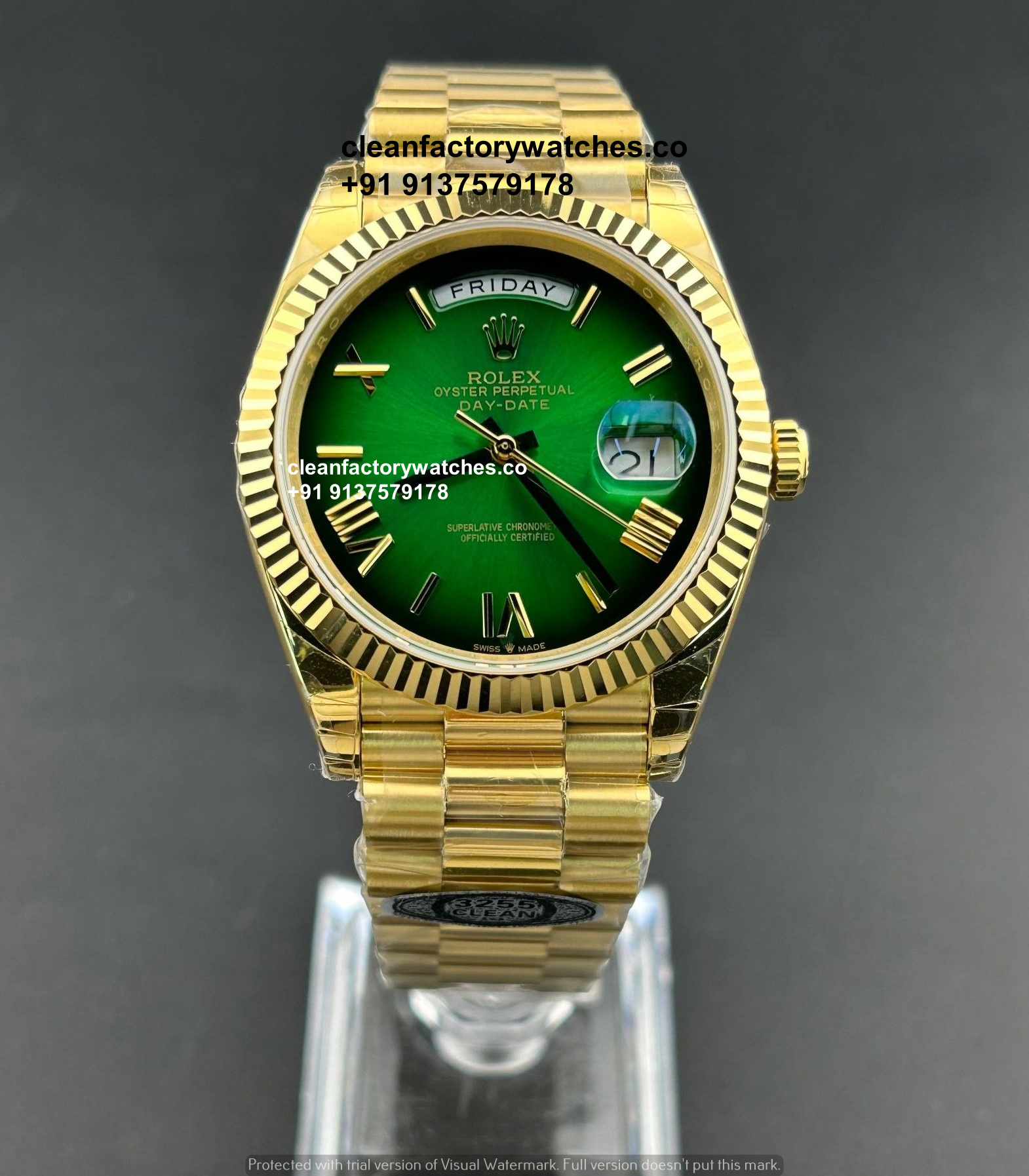Secure your timepiece today via the official link: https://cleanfactorywatches.co/clean-factory-rolex-day-date-ombre-green-superclone