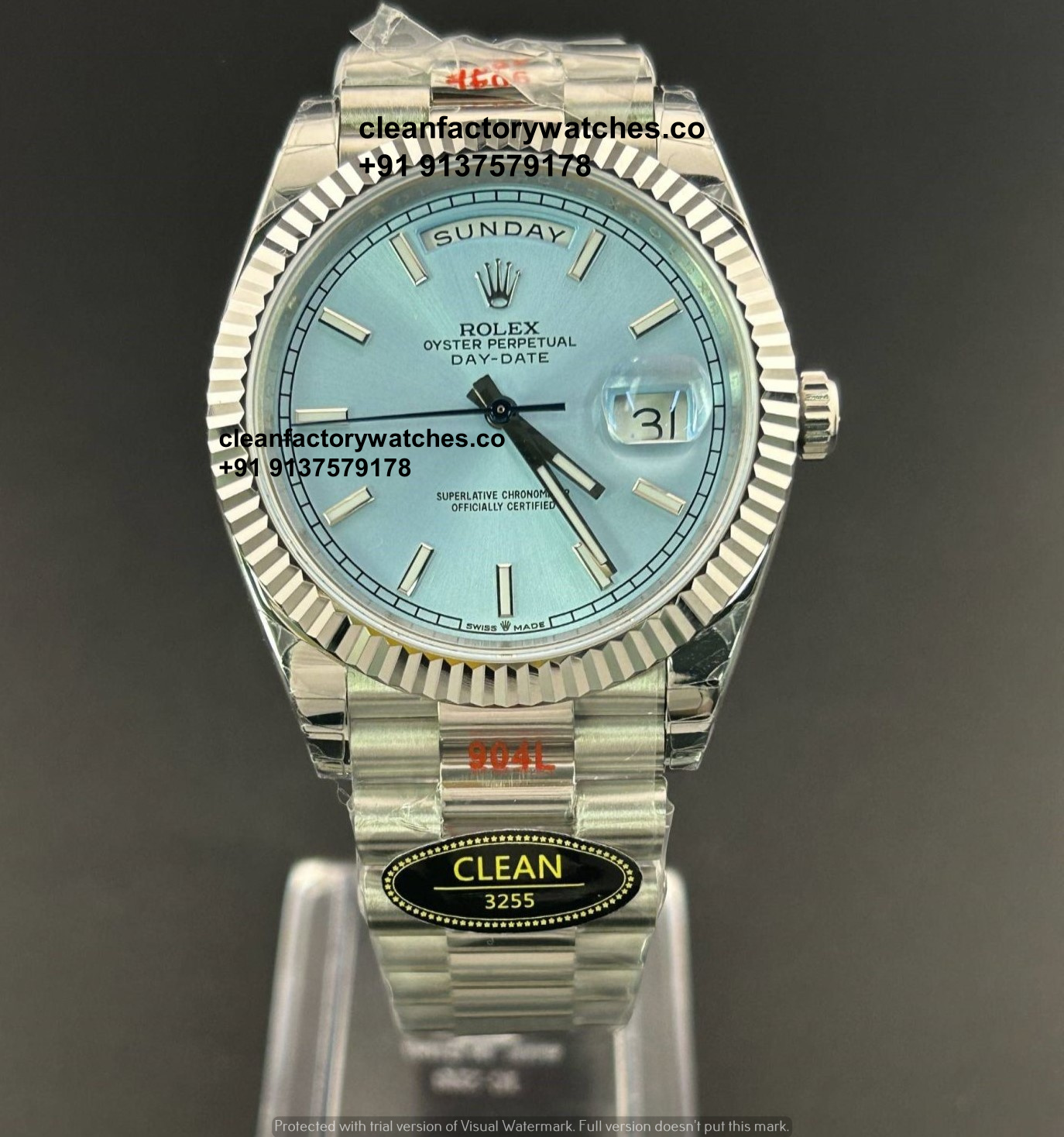 Experience the pinnacle of luxury with the Rolex Day-Date Platinum Ice Blue Dial Super Clone. Specifically engineered for the discerning Indian collector, this masterpiece features the revolutionary Tungsten Heavy Case construction, ensuring the watch has the same substantial “wrist feel” and weight as genuine 950 platinum. Powered by the ultra-reliable Calibre 3255 Clone Movement, this timepiece offers unparalleled precision and the iconic smooth day-date transition that Rolex is world-renowned for.